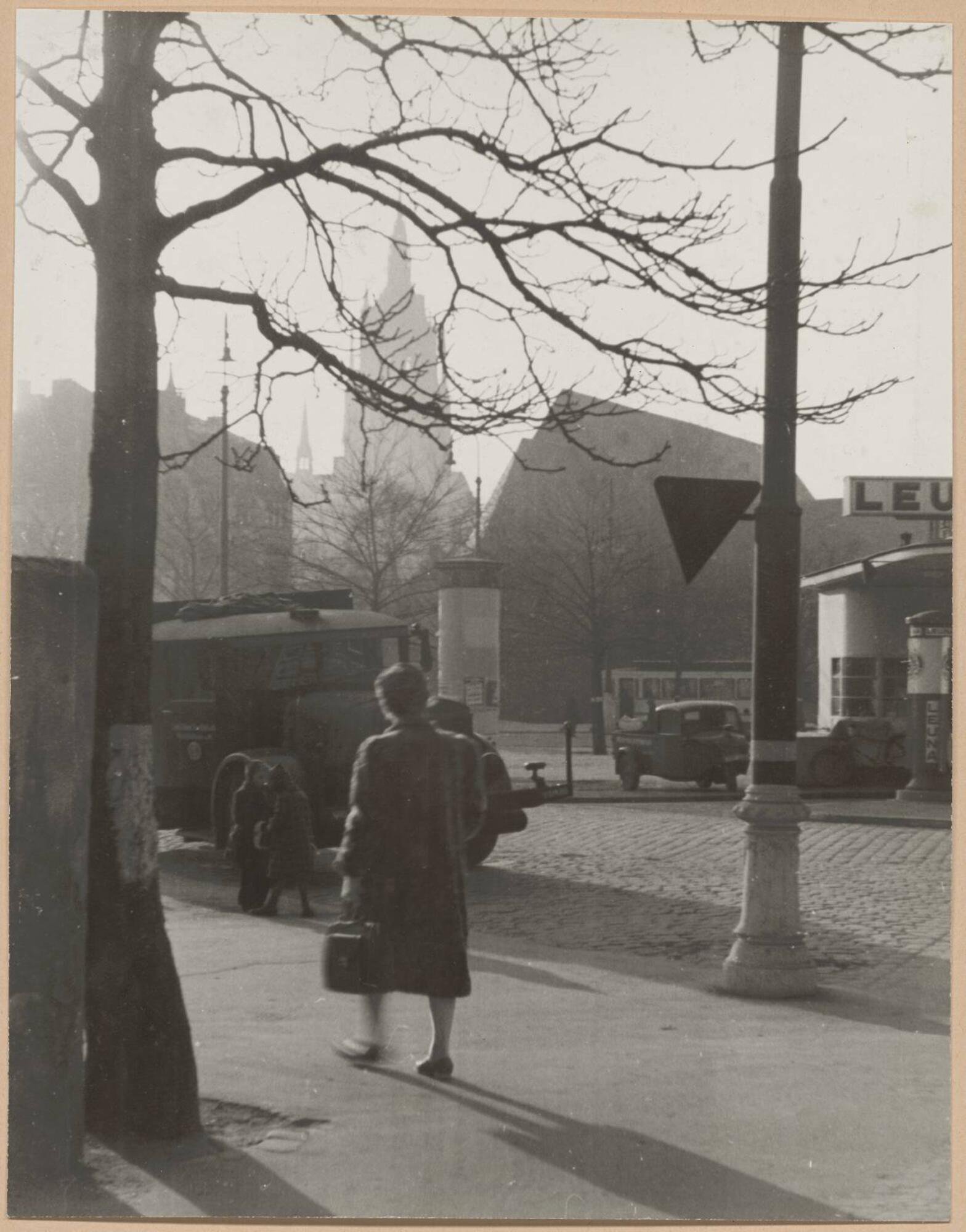 In Dominikanerplatz umbenannter Börneplatz in den 1940er Jahren mit Blick auf die Dominikanerkirche. Rechts im Bild ist eine Tankstelle zu sehen. Während der NS-Zeit wurde der Börneplatz in Dominikanerplatz umbenannt. Nach dem Krieg wurde der Platz zu einem belebten Verkehrsknotenpunkt, wenig erinnerte in dieser Zeit an die jüdische Geschichte dieses Ortes. Erst 1978 erhielt der Platz seinen ursprünglichen Namen zurück.